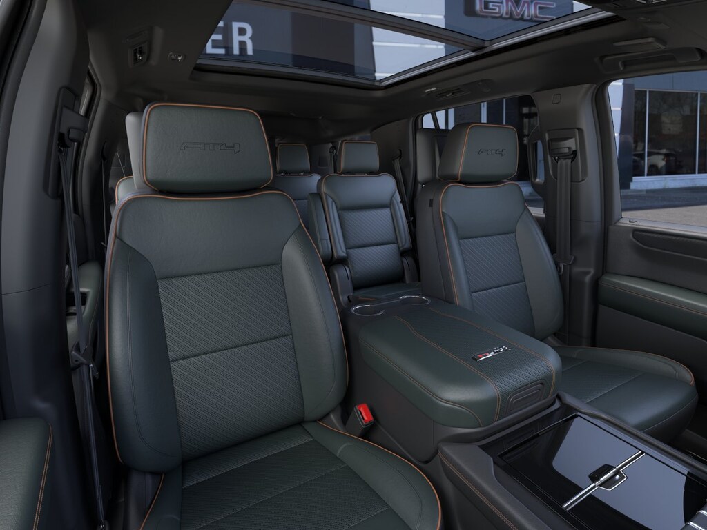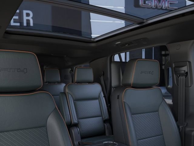 This vehicle is well equipped with these 4WD, 10 Speakers, 3.23 Rear Axle Ratio, 3rd row seats: split-bench, 4-Way Power Driver Lumbar Seat Adjuster, 4-Way Power Front Passenger Lumbar Seat Adjuster, 4-Wheel Disc Brakes, ABS brakes, Adaptive suspension, Air Conditioning, Alloy wheels, AM/FM radio: SiriusXM with 360L, Apple CarPlay/Android Auto, Audio memory, Auto High-beam Headlights, Auto-dimming door mirrors, Auto-dimming Rear-View mirror, Auto-leveling suspension, Automatic temperature control, AutoSense Hands-Free Power Liftgate, Black Roof-Mounted Luggage Rack Side Rails, Body-Color Door Handles, Bose 10-Speaker Surround with CenterPoint, Brake assist, Bright Front and Rear Door Sill Plates, Bumpers: body-color, Compass, Delay-off headlights, Driver door bin, Driver vanity mirror, Dual Exhaust System, Dual front impact airbags, Dual front side impact airbags, Electronic Stability Control, Emergency communication system: OnStar and GMC connected services capable, Exterior Parking Camera Rear, Four wheel independent suspension, Front anti-roll bar, Front Bucket Seats, Front Center Armrest, Front dual zone A/C, Front fog lights, Front High-Approach Angle Fascia, Front reading lights, Fully automatic headlights, Garage door transmitter, Heated door mirrors, Heated Driver and Front Passenger Seats, Heated front seats, Heated rear seats, Heated steering wheel, Heavy-Duty Air Filter, Hill Descent Control, Illuminated entry, Low tire pressure warning, Magnetic Ride Control Suspension, Memory seat, Navigation system: GMC Connected Navigation, Occupant sensing airbag, Outside temperature display, Overhead airbag, Overhead console, Panic alarm, Passenger door bin, Passenger vanity mirror, Perforated Heated and Ventilated Driver and Front Passenger Seats, Perforated Leather Seating Surfaces, Power door mirrors, Power driver seat, Power Liftgate, Power passenger seat, Power steering, Power Tilt and Telescopic Steering Column, Power windows, Radio: 16.8 Diagonal Premium GMC Infotainment System, Rain sensing wipers, Rear air conditioning, Rear anti-roll bar, Rear reading lights, Rear seat center armrest, Rear window defroster, Rear window wiper, Red Horizontal-Mounted Recovery Hooks, Remote keyless entry, Security system, SiriusXM with 360L, Speed control, Speed-sensing steering, Split folding rear seat, Spoiler, Steering wheel memory, Steering wheel mounted audio controls, Tachometer, Telescoping steering wheel, Tilt steering wheel, Traction control, Trip computer, Turn signal indicator mirrors, Variably intermittent wipers, Ventilated front seats, Voltmeter, and Wheels: 20 x 9 Machined and Painted.