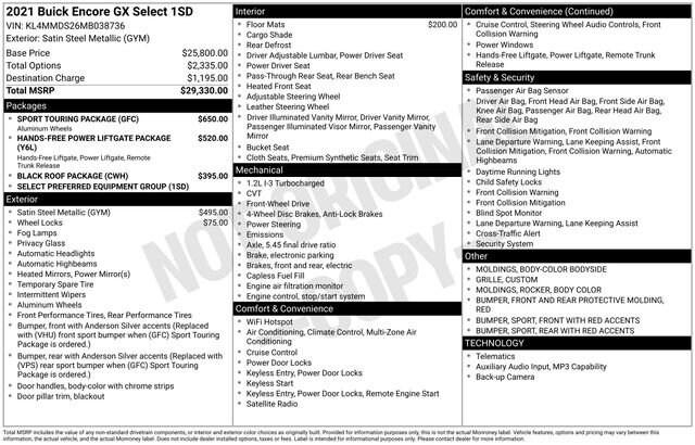 The Encore GX Select's striking exterior is enhanced by the Black Roof Package, which includes sleek black roof rails, mirror caps, and a bold roof panel. The Sport Touring Package further accentuates the vehicle's sporty flair with a custom grille, red-accented bumpers, and 18-inch alloy wheels.