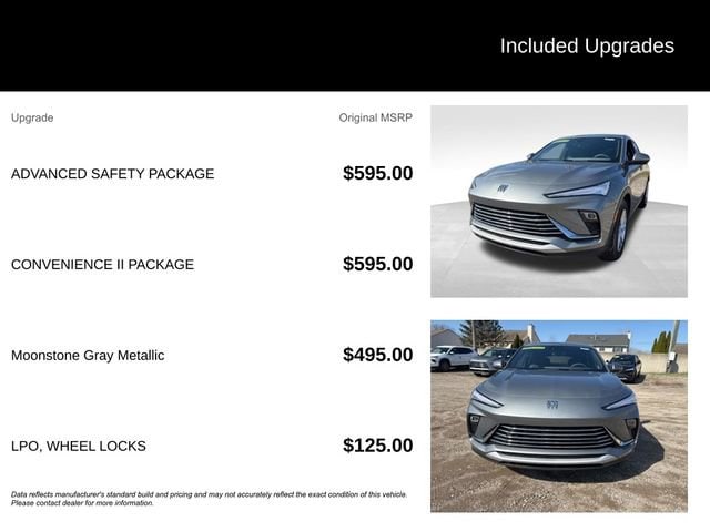 Clean CARFAX.Certified. Recent Arrival! Odometer is 18124 miles below market average! 28/32 City/Highway MPGMoonstone Gray Metallic 2025 Buick Envista Preferred FWD 6-Speed Automatic ECOTEC 1.2L TurboGOOD BRAKES, RECENT TRADE IN, Envista Preferred, 4D Sport Utility, ECOTEC 1.2L Turbo, 6-Speed Automatic, FWD, Moonstone Gray Metallic, Ebony Seats With Slate Interior Accents Cloth, 2 USB Ports (1 Type-A, 1 Type-C), 3.50 Final Drive Axle Ratio, 4-Way Manual Front Passenger Seat Adjuster, 4-Wheel Disc Brakes, 6 Speakers, 6-Way Manual Driver Seat Adjuster, ABS brakes, Adaptive Cruise Control, Advanced Safety Package, Air Conditioning, Alloy wheels, AM/FM radio: SiriusXM, Auto High-beam Headlights, Automatic temperature control, Brake assist, Cloth w/Leatherette Seat Trim, Convenience II Package, Delay-off headlights, Dual front impact airbags, Dual front side impact airbags, Electronic Stability Control, Emergency communication system: OnStar, Exterior Parking Camera Rear, Front anti-roll bar, Front Bucket Seats, Front Center Armrest, Front Intermittent Rainsense Wipers, Front wheel independent suspension, Fully automatic headlights, Lane Change Alert w/Side Blind Zone Alert, Low tire pressure warning, Occupant sensing airbag, Overhead airbag, Passenger door bin, Power Liftgate, Power steering, Power windows, Preferred Equipment Group G02, Premium 6-Speaker Audio System Feature, Radio data system, Radio: AM/FM Stereo Audio System, Rear Cross Traffic Alert, Rear Parking Sensors, Rear window defroster, Remote keyless entry, SiriusXM Trial Subscription, Steering wheel mounted audio controls, Traction control, Variably intermittent wipers, Wheels: 17 Bright Silver Painted Aluminum, Wireless Apple CarPlay/Wireless Android Auto, Wireless Charging.Our dealership is family owned and operated and has been serving Oakland County and its surrounding communities since 1954. Lunghamer Buick GMC is focused on excellent customer service. We will find the right vehicle for your life style, the right financing to fit your budget, and a total ownership experience second to none. We are here to service you. Joe Knows that service repairs never fit into your busy schedule. That's why we offer convenient service hours Monday through Friday, 8am-5pm. We feature highly trained service advisors and factory trained technicians, we feature state of the art equipment, and we realize that repairing your vehicle right the first time at a fair price will keep you coming back for years to come. We invite you to come down and take a stroll through our large inventory of new and used vehicles, talk to our sales and service advisors, have a free coffee, tea, or water and make Lunghamer Buick GMC your sales and servicing dealer. Call us today at 248-461-1000 and let us know how we can help!JOE KNOWS USED CARS! * CPO APR AVAILABLE ON SELECT MODELS FOR WELL QUALIFIED BUYERS.