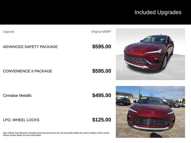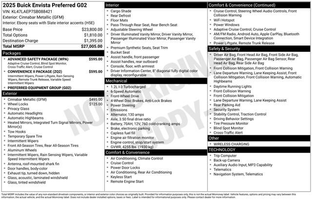 Clean CARFAX.Certified. Recent Arrival! Odometer is 18364 miles below market average! 28/32 City/Highway MPGCinnabar Metallic 2025 Buick Envista Preferred FWD 6-Speed Automatic ECOTEC 1.2L TurboGOOD TIRES, REAR BACK UP CAMERA, GOOD BRAKES, RECENT TRADE IN, Envista Preferred, 4D Sport Utility, ECOTEC 1.2L Turbo, 6-Speed Automatic, FWD, Cinnabar Metallic, Ebony Seats With Slate Interior Accents Cloth, 2 USB Ports (1 Type-A, 1 Type-C), 4-Way Manual Front Passenger Seat Adjuster, 6 Speakers, 6-Way Manual Driver Seat Adjuster, Adaptive Cruise Control, Advanced Safety Package, Air Conditioning, Alloy wheels, AM/FM radio: SiriusXM, Auto High-beam Headlights, Automatic temperature control, Brake assist, Cloth w/Leatherette Seat Trim, Convenience II Package, Delay-off headlights, Electronic Stability Control, Exterior Parking Camera Rear, Front Bucket Seats, Front Center Armrest, Front Intermittent Rainsense Wipers, Fully automatic headlights, Lane Change Alert w/Side Blind Zone Alert, Low tire pressure warning, Occupant sensing airbag, Overhead airbag, Panic alarm, Passenger door bin, Power Liftgate, Power steering, Power windows, Preferred Equipment Group G02, Premium 6-Speaker Audio System Feature, Radio data system, Radio: AM/FM Stereo Audio System, Rear Cross Traffic Alert, Rear Parking Sensors, Rear window defroster, Remote keyless entry, Security system, SiriusXM Trial Subscription, Split folding rear seat, Steering wheel mounted audio controls, Traction control, Variably intermittent wipers, Wheels: 17 Bright Silver Painted Aluminum, Wireless Apple CarPlay/Wireless Android Auto, Wireless Charging.Our dealership is family owned and operated and has been serving Oakland County and its surrounding communities since 1954. Lunghamer Buick GMC is focused on excellent customer service. We will find the right vehicle for your life style, the right financing to fit your budget, and a total ownership experience second to none. We are here to service you. Joe Knows that service repairs never fit into your busy schedule. That's why we offer convenient service hours Monday through Friday, 8am-5pm. We feature highly trained service advisors and factory trained technicians, we feature state of the art equipment, and we realize that repairing your vehicle right the first time at a fair price will keep you coming back for years to come. We invite you to come down and take a stroll through our large inventory of new and used vehicles, talk to our sales and service advisors, have a free coffee, tea, or water and make Lunghamer Buick GMC your sales and servicing dealer. Call us today at 248-461-1000 and let us know how we can help!JOE KNOWS USED CARS! * CPO APR AVAILABLE ON SELECT MODELS FOR WELL QUALIFIED BUYERS.