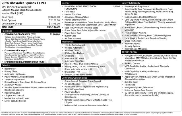 This Equinox LT is packed with features that make every drive more convenient and comfortable. The Convenience Package II adds thoughtful touches like a hands-free power liftgate, wireless charging, and dual-zone climate control, ensuring you and your passengers enjoy a premium experience. The advanced infotainment system with SiriusXM radio keeps you entertained, while the suite of driver-assist technologies, including auto high-beam headlights and rain-sensing wipers, provide added peace of mind on the road.