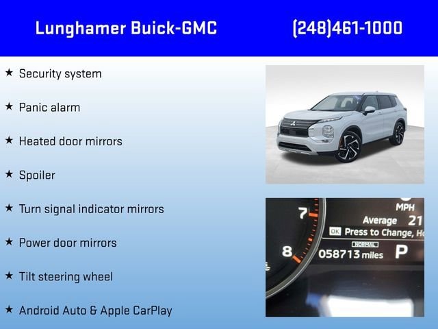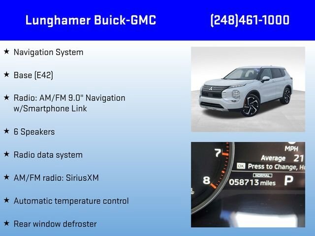 Clean CARFAX. CARFAX One-Owner.Priced below KBB Fair Purchase Price! 24/30 City/Highway MPGWhite Diamond/Black Roof 2024 Mitsubishi Outlander SE 4WD CVT 2.5L 4-Cylinder DOHCOutlander SE, 4D Sport Utility, 2.5L 4-Cylinder DOHC, CVT, 4WD, White Diamond/Black Roof, Black w/Synthetic Leather Seat Trim, 3rd row seats: split-bench, 6 Speakers, Air Conditioning, Alloy wheels, AM/FM radio: SiriusXM, Android Auto & Apple CarPlay, Auto High-beam Headlights, Automatic temperature control, Base (E42), Brake assist, Electronic Stability Control, Exterior Parking Camera Rear, Front Bucket Seats, Front Center Armrest w/Storage, Front dual zone A/C, Front fog lights, Fully automatic headlights, Headlight cleaning, Heated door mirrors, Heated Front Bucket Seats, Heated front seats, Navigation System, Panic alarm, Passenger door bin, Power door mirrors, Power driver seat, Power Liftgate, Power steering, Power windows, Radio data system, Radio: AM/FM 9.0 Navigation w/Smartphone Link, Rear window defroster, Reclining 3rd row seat, Remote keyless entry, Security system, Split folding rear seat, Spoiler, Steering wheel mounted audio controls, Synthetic Leather Seat Trim, Tachometer, Telescoping steering wheel, Tilt steering wheel, Traction control, Turn signal indicator mirrors.Our dealership is family owned and operated and has been serving Oakland County and its surrounding communities since 1954. Lunghamer Buick GMC is focused on excellent customer service. We will find the right vehicle for your life style, the right financing to fit your budget, and a total ownership experience second to none. We are here to service you. Joe Knows that service repairs never fit into your busy schedule. That's why we offer convenient service hours Monday through Friday, 8am-5pm. We feature highly trained service advisors and factory trained technicians, we feature state of the art equipment, and we realize that repairing your vehicle right the first time at a fair price will keep you coming back for years to come. We invite you to come down and take a stroll through our large inventory of new and used vehicles, talk to our sales and service advisors, have a free coffee, tea, or water and make Lunghamer Buick GMC your sales and servicing dealer. Call us today at 248-461-1000 and let us know how we can help!JOE KNOWS USED CARS! * CPO APR AVAILABLE ON SELECT MODELS FOR WELL QUALIFIED BUYERS.
